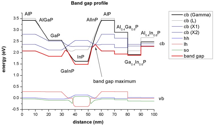 The following figure shows the conduction band edges at the Gamma, L and X points and the heavy hole, light hole and split-off hole valence bands.